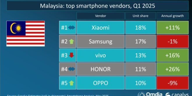 Canalys, a global market research firm, has announced that Xiaomi has once again secured the top position among smartphone vendors in Malaysia for the first quarter of 2025.